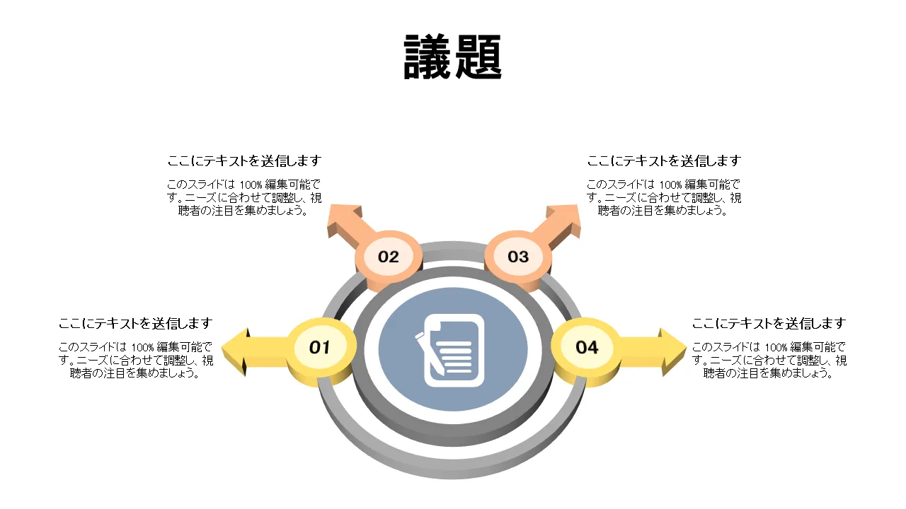 会議プレゼンテーション用に専門的にデザインされた議題 PPT アイデア。ビジネスプロフェッショナル、コンサルタント、チームに最適な、モダンなデザインの編集可能なスライド。きれいなレイアウトですぐにカスタマイズできます。