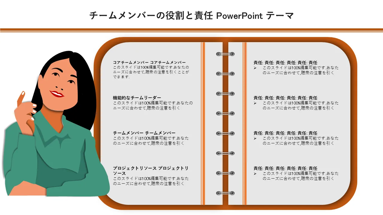 人事チームとマネージャー向けの包括的なチームメンバーの役割と責任のパワーポイントテーマ。従業員の新人研修、トレーニング計画、業績評価、組織開発に最適です。完全にカスタマイズ可能なスライド。