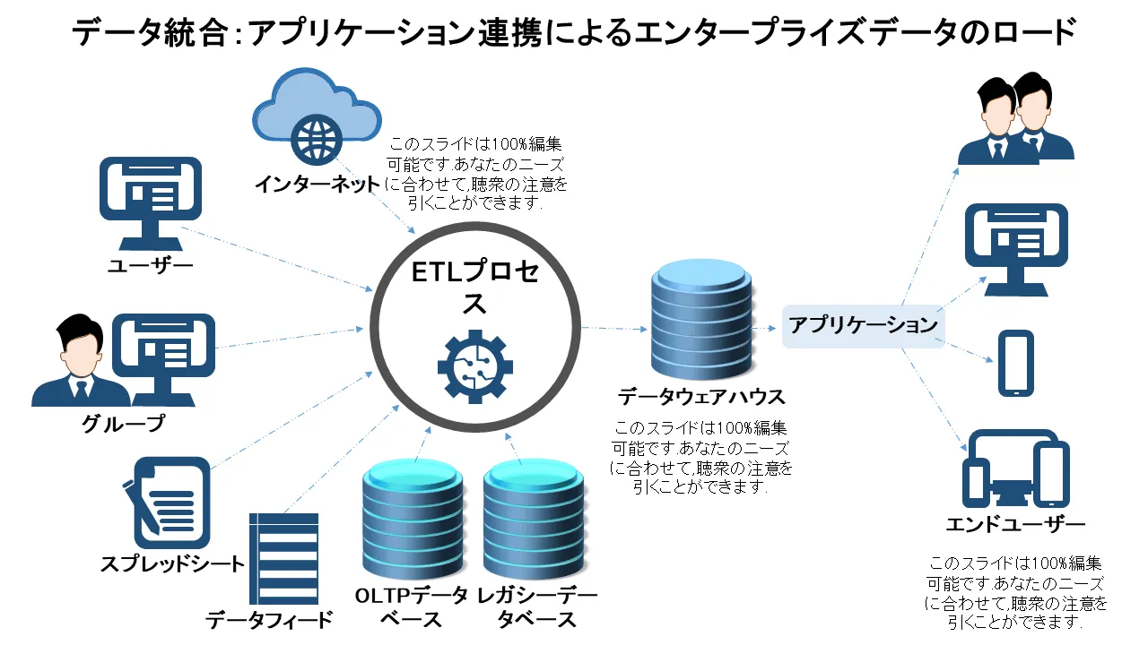 データ分析プレゼンテーション用に、アプリケーションとエンド ユーザーによるエンタープライズ データの負荷を示す、専門的に設計されたデータ統合。ビジネスプロフェッショナル、コンサルタント、チームに最適な、モダンなデザインの編集可能なスライド。すっきりとしたレイアウト領域...
