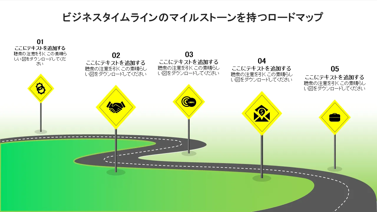 ビジネスタイムラインのマイルストーンを含むロードマップフラットPowerPointのデザインプロフェッショナルプレゼンテーション用のPowerPointのテンプレート