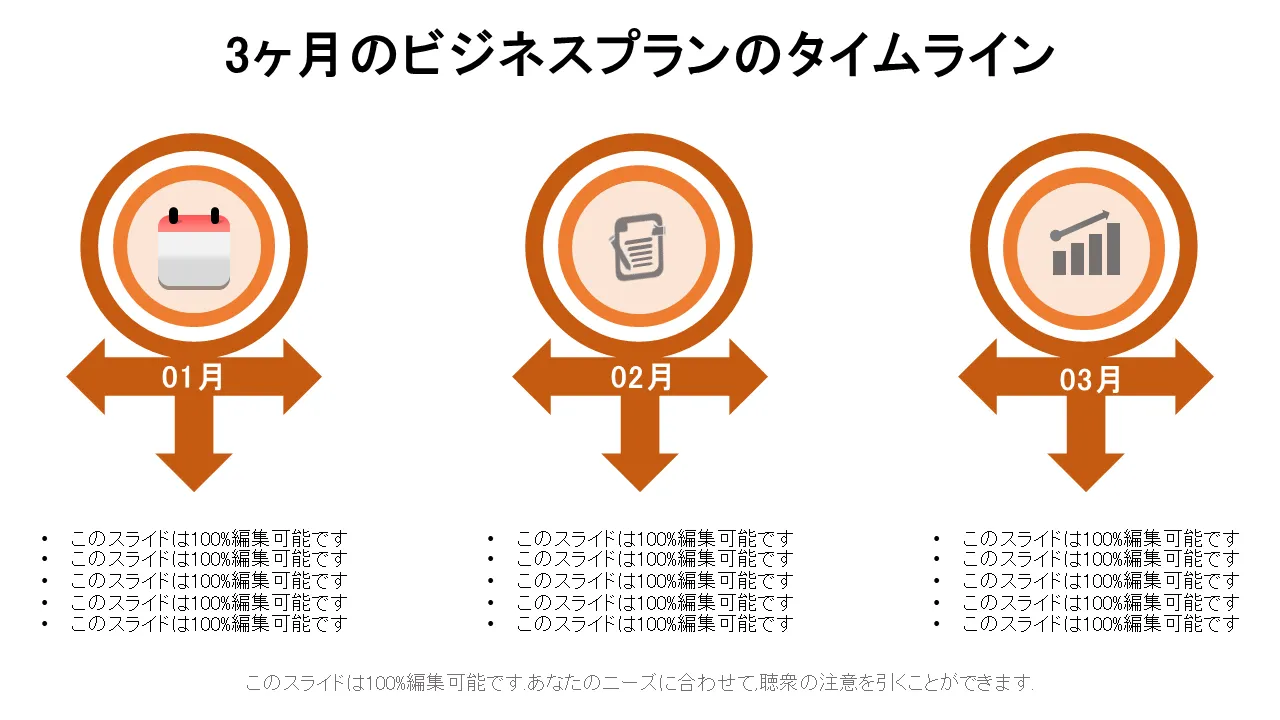 ビジネス プラン プレゼンテーション用に専門的にデザインされた月次ビジネス プランニング タイムライン。ビジネスプロフェッショナル、コンサルタント、チームに最適な、モダンなデザインの編集可能なスライド。きれいなレイアウトですぐにカスタマイズできます。