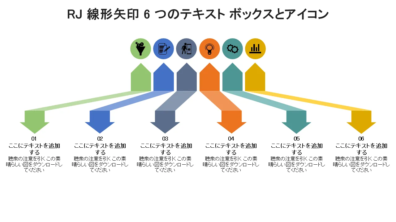 6つのテキストボックスとアイコンを備えたRj線形矢印フラットPowerPointのデザインプロフェッショナルなプレゼンテーションのためのPowerPointのテンプレート