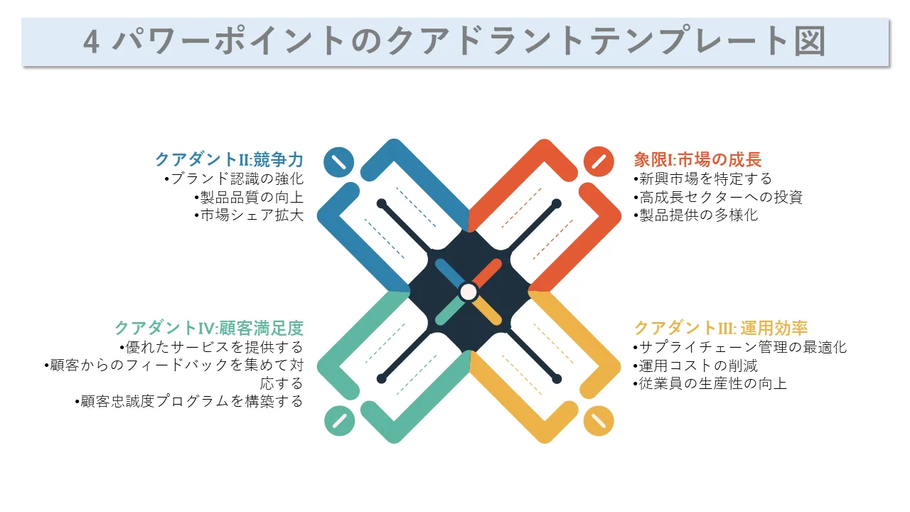 ビジネス戦略、市場でのポジショニング、または SWOT 分析を視覚化するための PowerPoint 用のきれいな 4 象限図テンプレート。構造化された視覚的な計画を必要とするコンサルタント、経営幹部、チームに最適です。