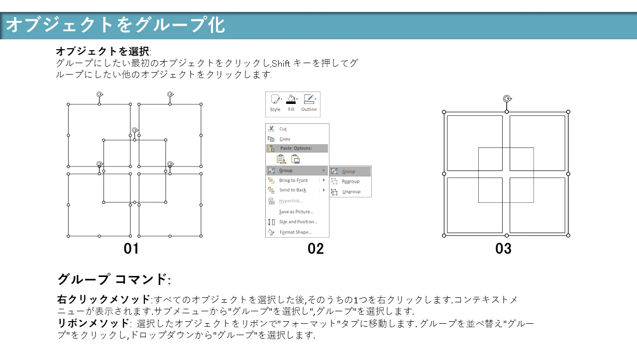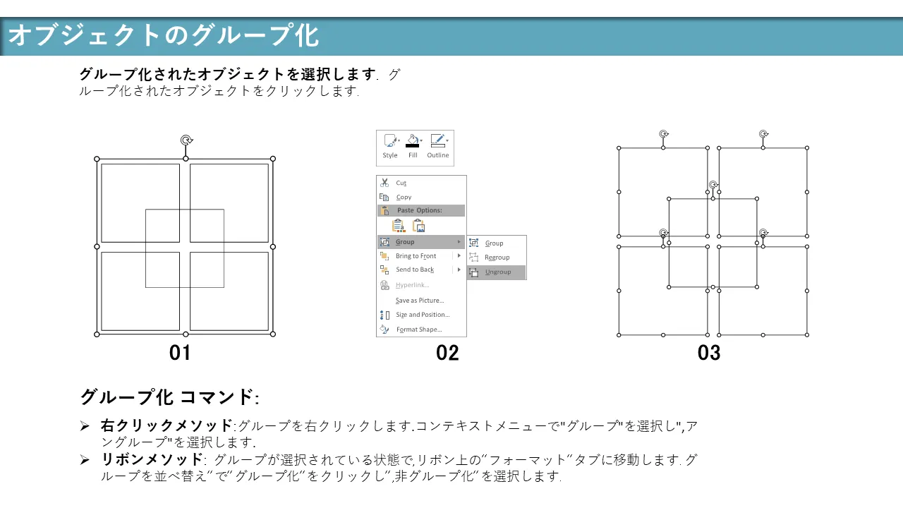 - 要素のカスタマイズを容易にするためのグループ化とグループ化解除の手順
