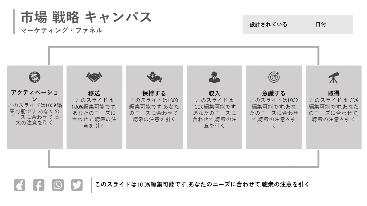 このテンプレートは、包括的な Go To Market 戦略を開発および提示するための視覚的なフレームワークを提供します。これは、チームが顧客のニーズ、ポジショニング、チャネル、収益モデルを明確かつ構造化された方法でマッピングするのに役立ちます。製品の発売、投資家への売り込み、社内戦略セッションに最適で、複雑な計画を簡略化して実用的なビジュアル ガイドにまとめます。