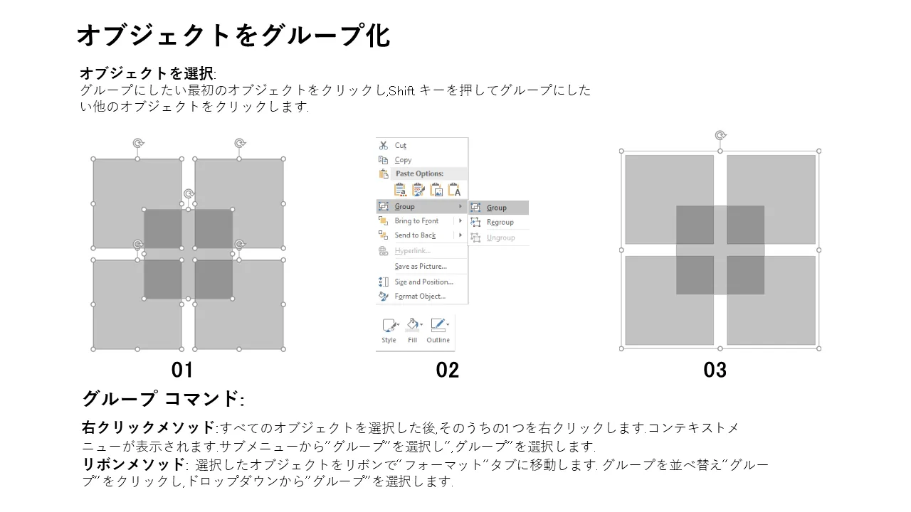 - 要素を簡単にグループ化およびグループ解除する手順PowerPoint での編集
