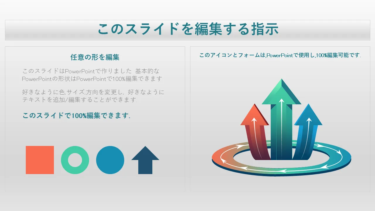 この視覚的に魅力的な PowerPoint テンプレートは、3 つのアニメーション矢印を使用して、成長、プロセス、適応という中核となる戦略概念を表しています。戦略的計画に焦点を当てたプレゼンテーションに最適なこのテンプレートは、モーション デザインを採用して、前進の勢い、周期的なワークフロー、応答性の高い変化に関する重要なメッセージを強化します。レイアウトはすっきりしていてプロフェッショナルなので、経営幹部やビジネス開発チームに適しています。