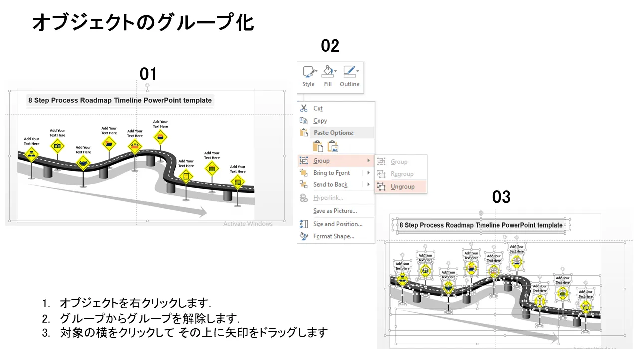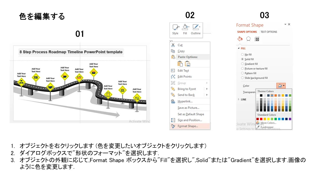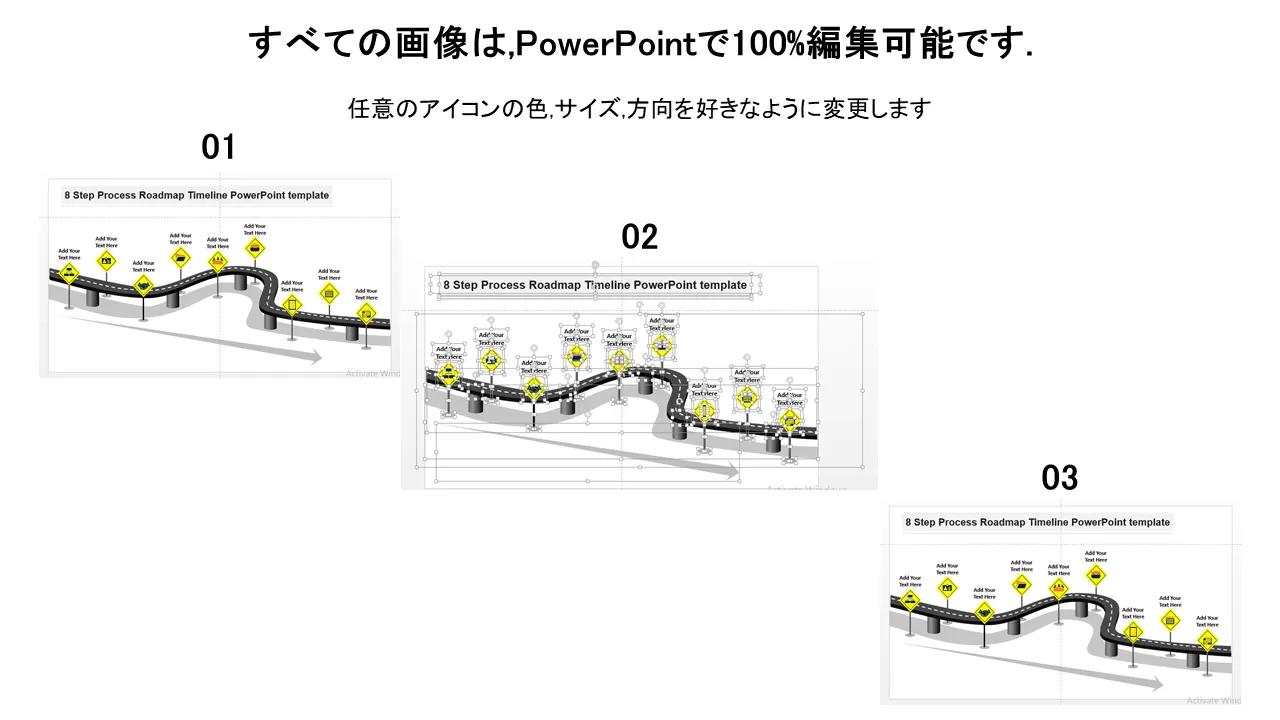 8 ステップ プロセス ロードマップ タイムライン PowerPoint テンプレートの説明