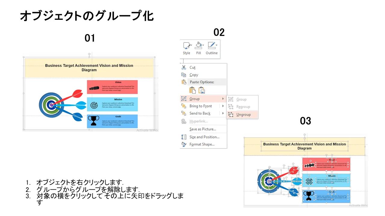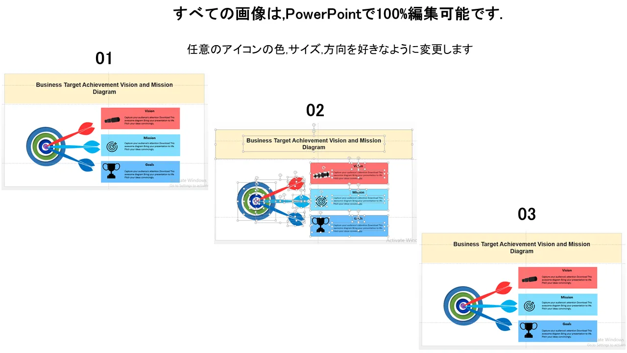 ビジネス目標達成のビジョンとミッション図のパワーポイント テンプレートの特徴