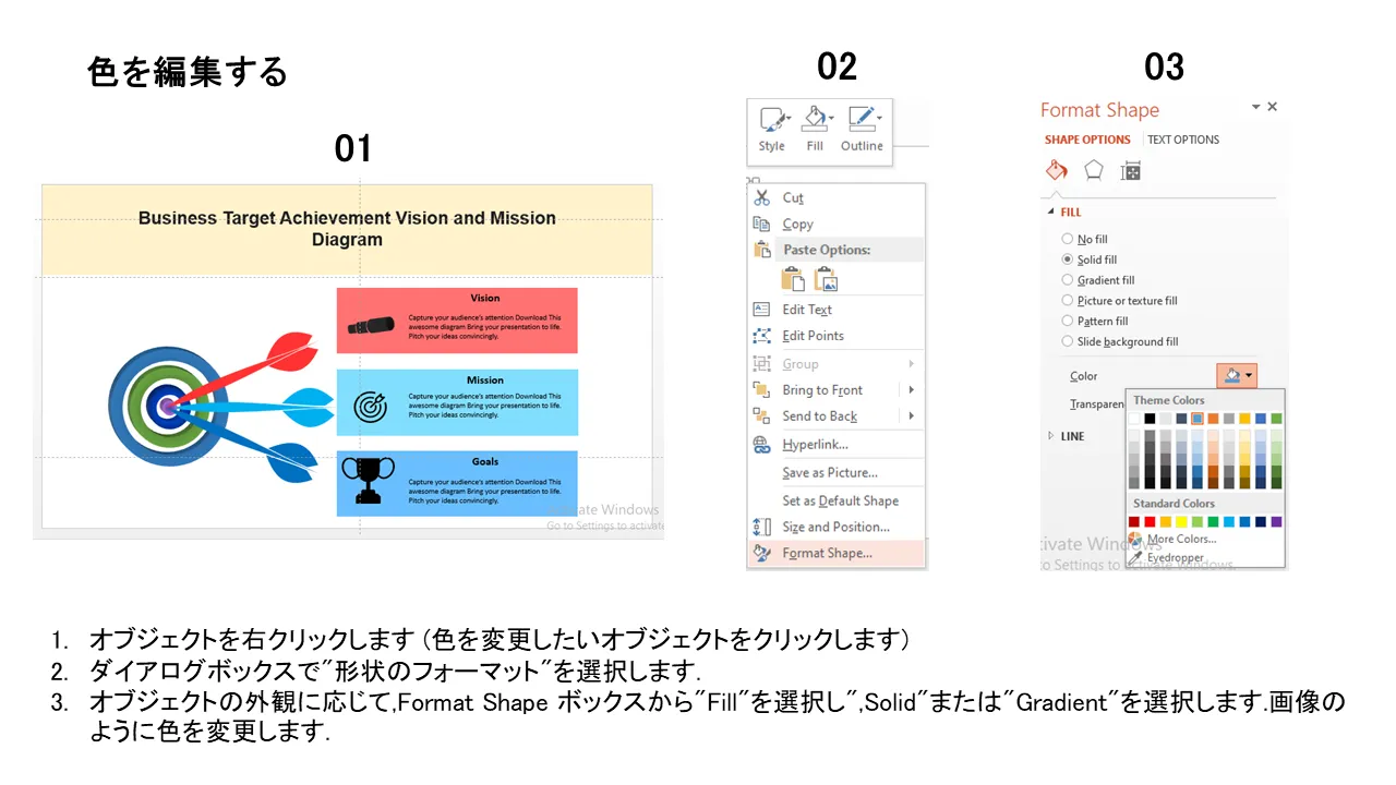 ビジネス ビジョン ミッション図の PowerPoint テンプレートの説明