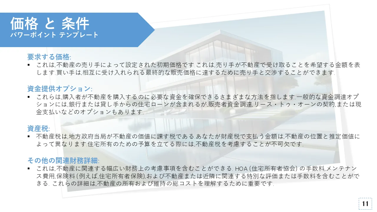 ビジネスプレゼンテーション用の不動産リストPowerPointのテンプレートの特徴