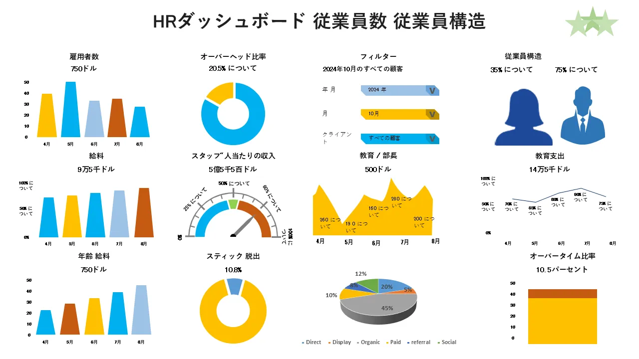 この専門的にデザインされた PowerPoint テンプレートは、構造化されたビジュアル、クリーンなタイポグラフィ、最新のデザイン言語を通じて KPI ダッシュボードの概念を示しています。発表者が複雑なアイデアを明確かつインパクトをもって伝えるのに役立ち、役員会議室、仮想会議、会議でのプレゼンテーションに最適です。このテンプレートは、視覚的な魅力と情報の深さのバランスをとり、すべてのスライドが視聴者に最大の価値を提供することを保証します。