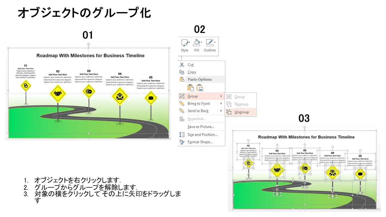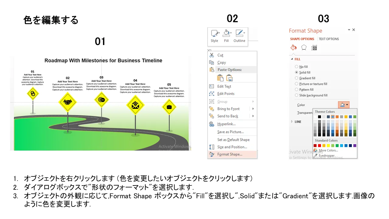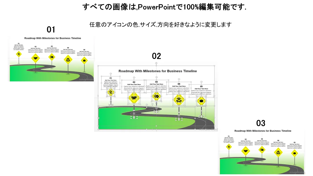 ビジネスタイムラインのマイルストーンを含むロードマップフラットPowerPointのデザインプロフェッショナルプレゼンテーション用のPowerPointのテンプレートの特徴