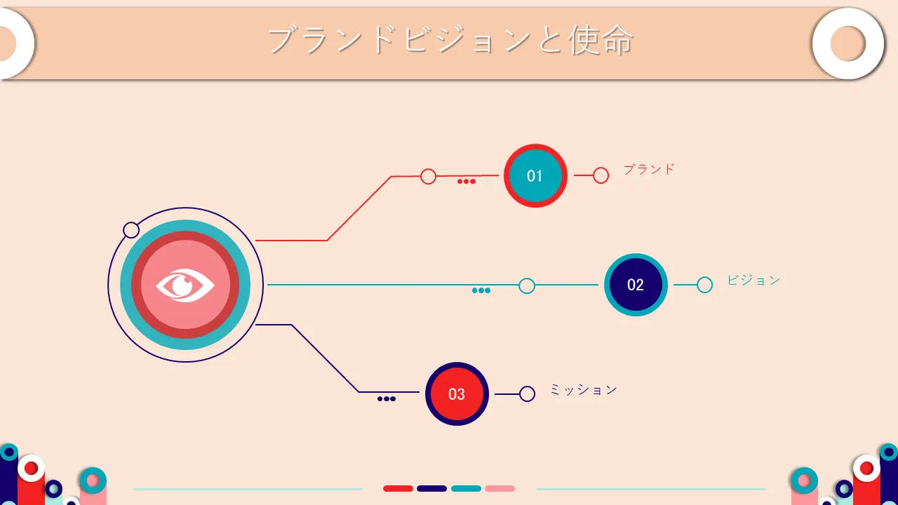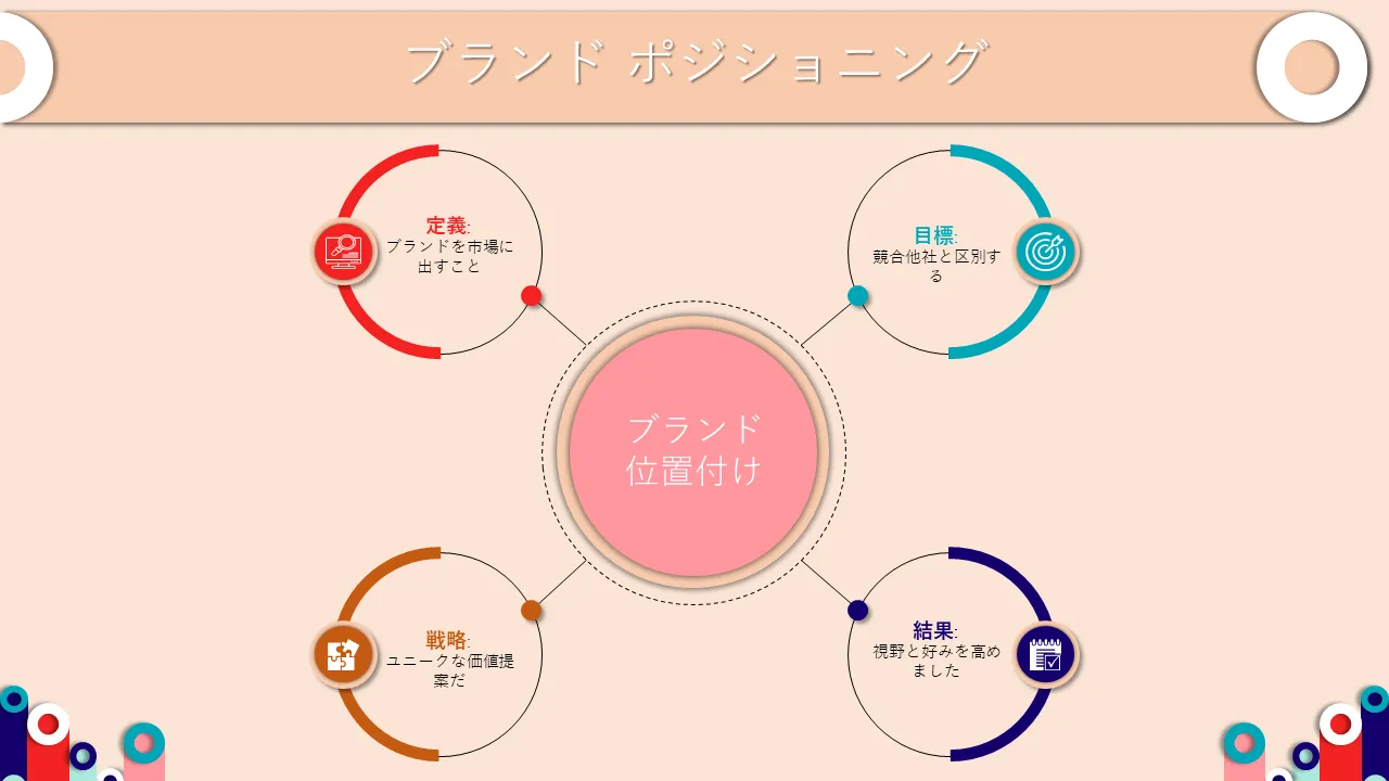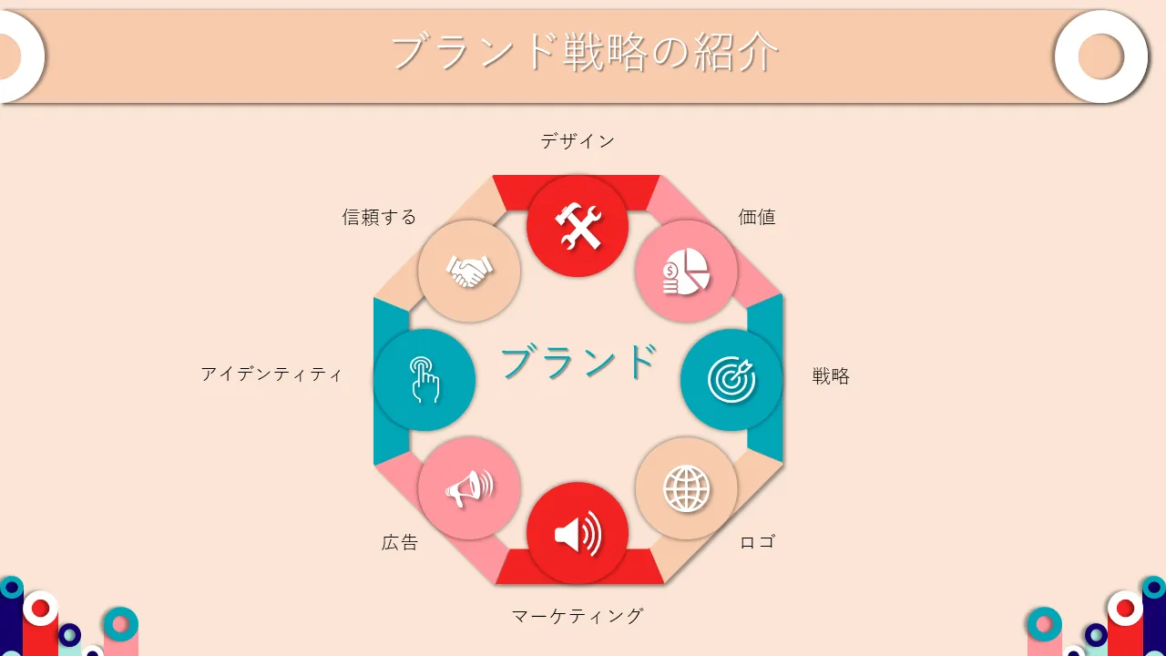 - ブランドのポジショニング、個性、ビジュアルメッセージング用に、一貫したレイアウトで事前にデザインされたスライド