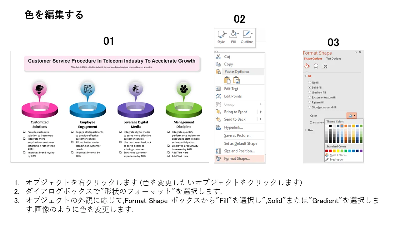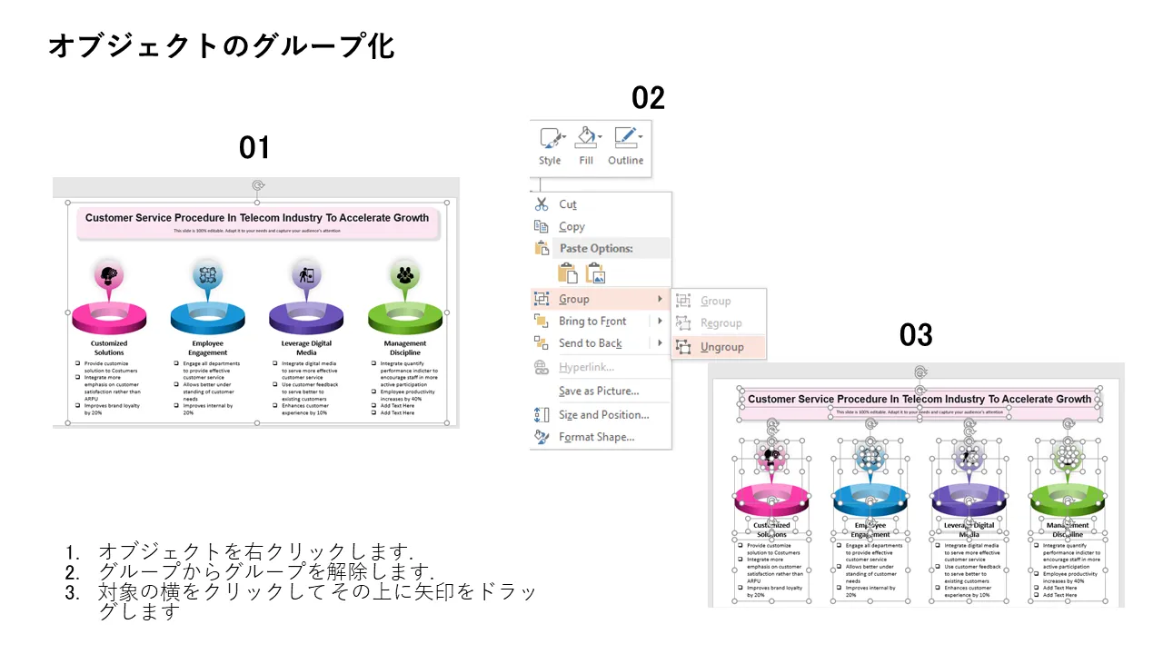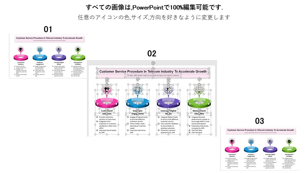このプロフェッショナルな PowerPoint テンプレートは、通信会社が満足度と業務効率の向上を通じて成長を促進する明確な顧客サービス手順の概要を示し、提示できるように設計されています。 ARPUなどの従来の指標よりも顧客中心の戦略を重視しており、優先順位を再調整しようとしているリーダーシップチームにとって理想的です。このテンプレートは完全にカスタマイズ可能で視覚的に魅力的で、プレゼンターがプロセスの改善や従業員エンゲージメントの取り組みを効果的に伝えるのに役立ちます。