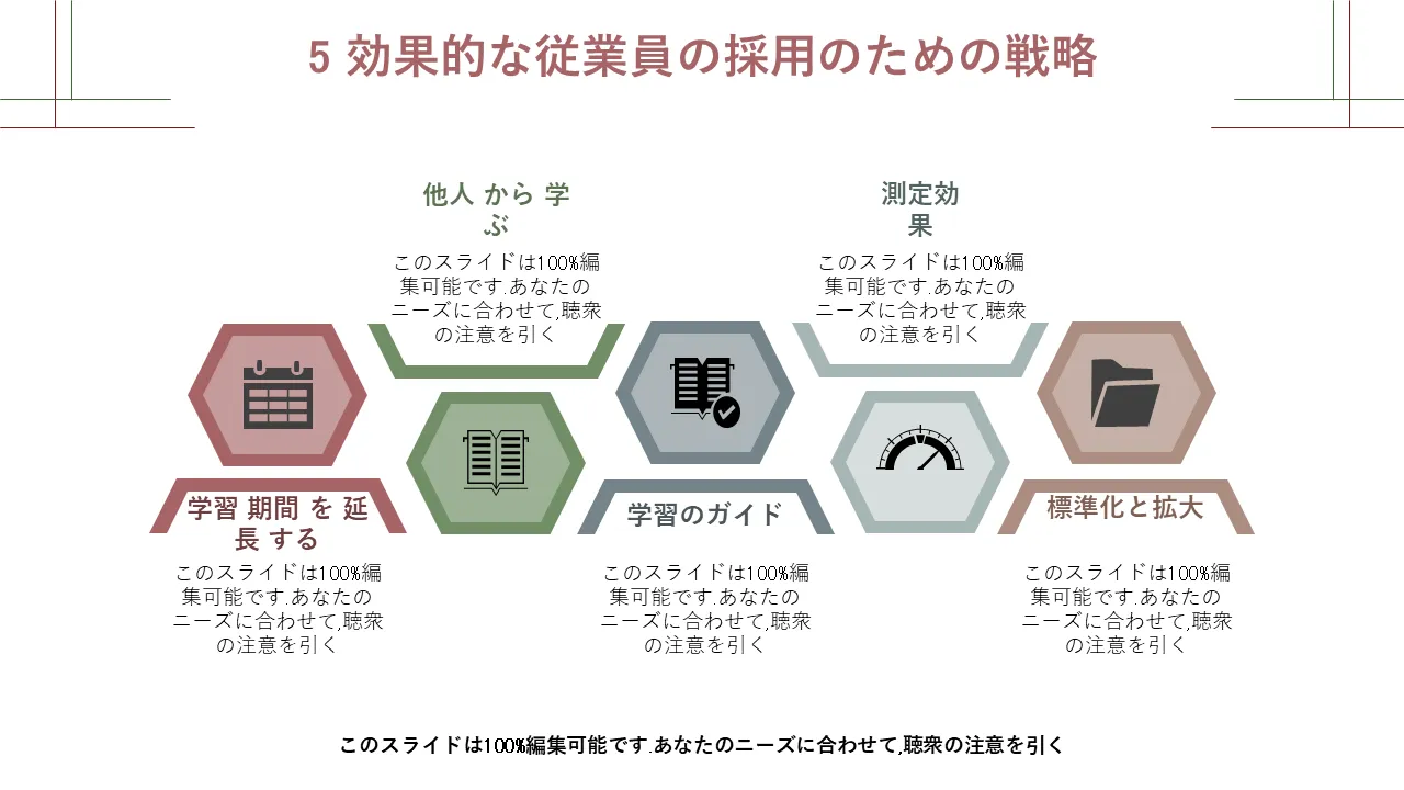 このテンプレートは、人事ディレクター、タレント マネージャー、チーム リーダーが従業員の能力開発計画、組織再構築、パフォーマンス管理戦略を提示する際に使用されます。新人研修セッション、人事レビュー、リーダーシップ ワークショップに最適です。テクノロジー、金融、ヘルスケア、教育などの業界は、その明快さとプロフェッショナルなデザインの恩恵を受けています。