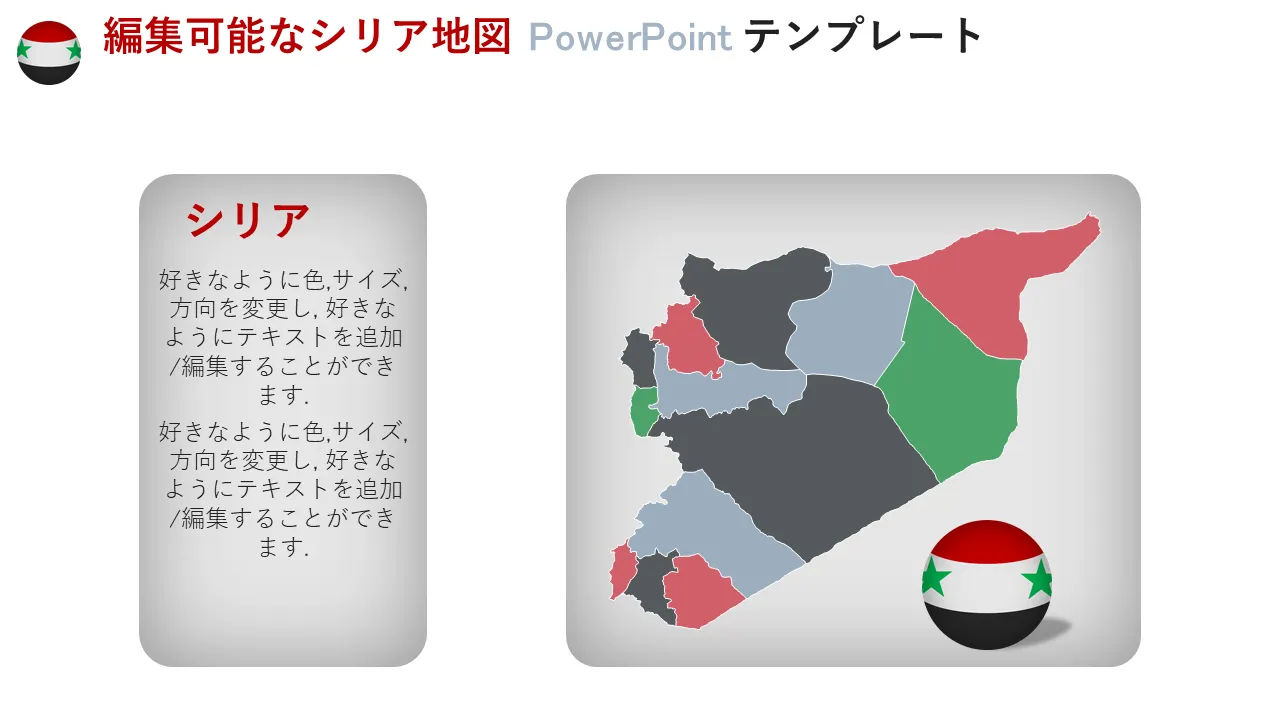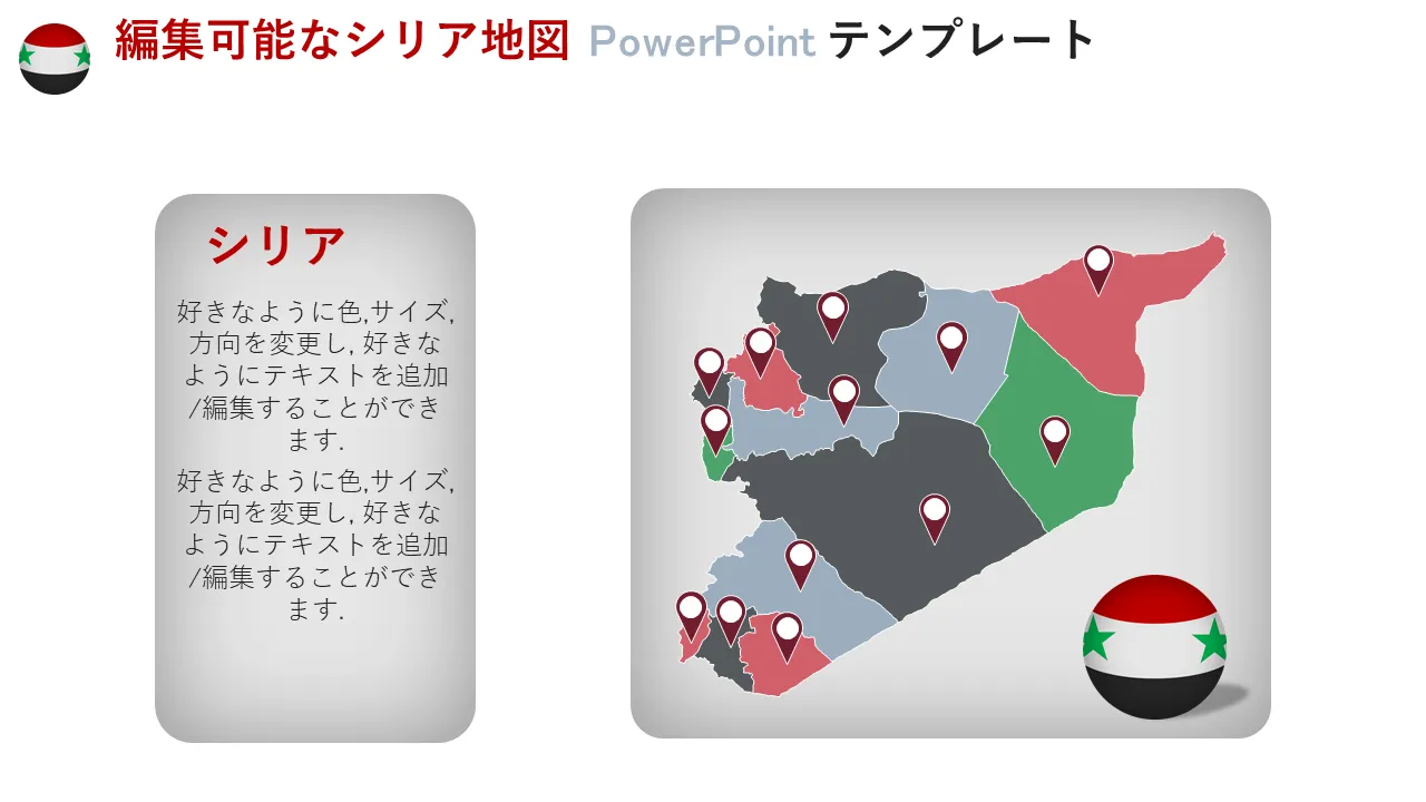 ビジネス アナリスト、コンサルタント、地域戦略家は、このテンプレートを使用して、市場調査結果、顧客セグメンテーション マップ、またはシリアのサプライ チェーン ロジスティクスを提示します。これは、この地域で活動する NGO、国際企業、政府機関にとって特に役立ちます。投資家向け最新情報や企業戦略デッキを準備している幹部は、そのクリーンなレイアウトとプロフェッショナルな美しさのメリットを享受できます。