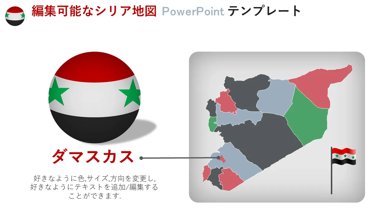 この PowerPoint テンプレートは、戦略的なビジネス プレゼンテーションをサポートするように設計された、シリアのダマスカスの視覚的に魅力的な地図を提供します。これは、地理的背景、地域市場のダイナミクス、またはシリア首都内の運用物流を説明する必要があるチームに最適です。このテンプレートには、明確な視覚的階層と直感的なデザイン要素が統合されており、ユーザーが自信を持って複雑な空間データを伝達できるようにします。