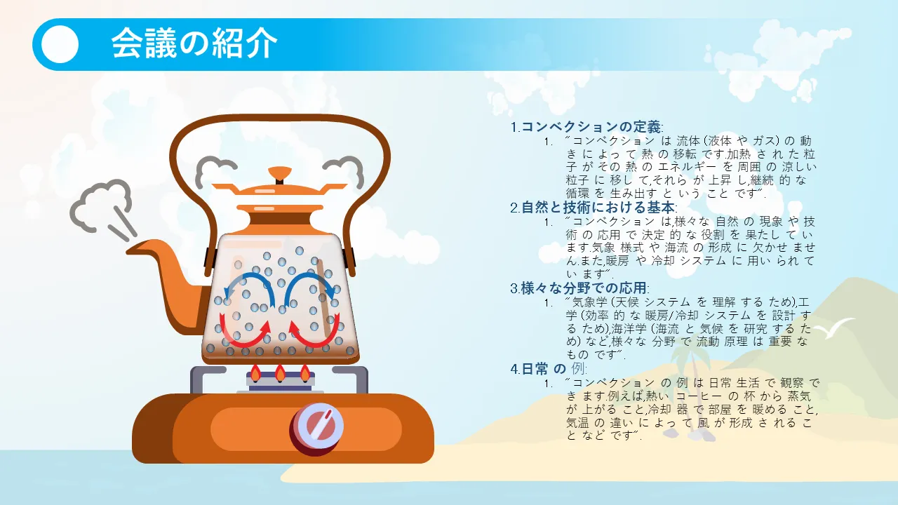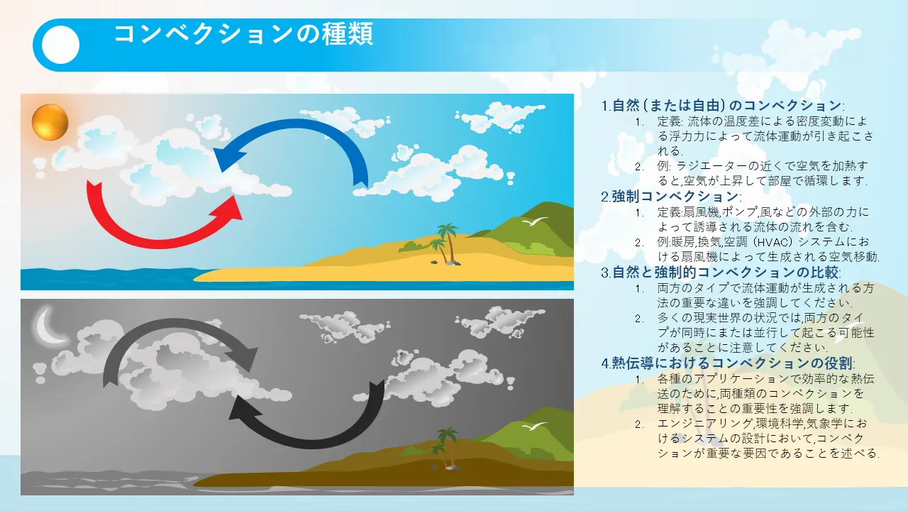 この PowerPoint テンプレートは、ユーザーが対流プロセスを明確かつ正確に視覚的に表現できるように設計されています。技術者向けに最適で、直観的な図とステップバイステップの視覚的なガイダンスを使用して、複雑な熱伝達の概念を簡素化します。このテンプレートは教育用と専門的なプレゼンテーションの両方をサポートしているため、エンジニア、物理学者、教育者にとって貴重なツールになります。流体力学と熱運動の理解を促進するために視覚的な構成を強調しています。