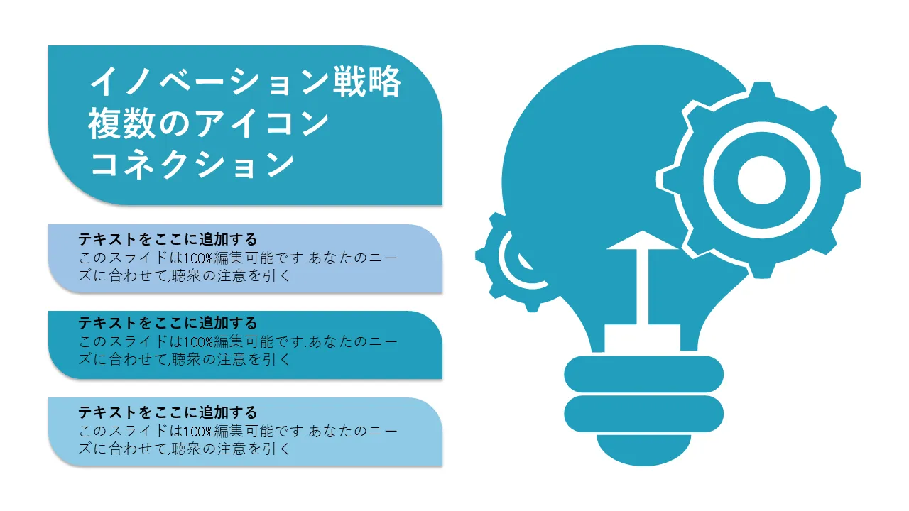 イノベーション戦略フレームワーク 電球接続 策定成功アプローチ プロフェッショナルプレゼンテーション用のPowerPointのテンプレートの特徴