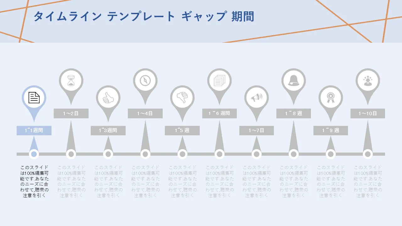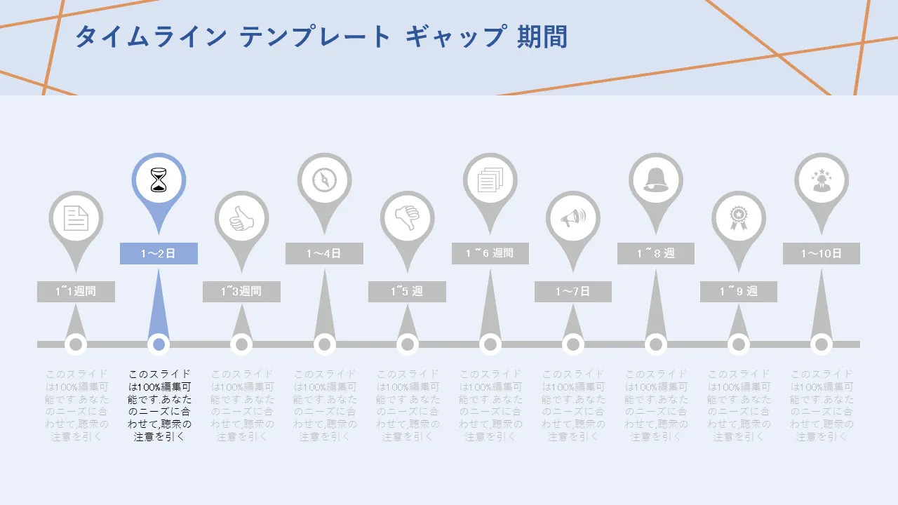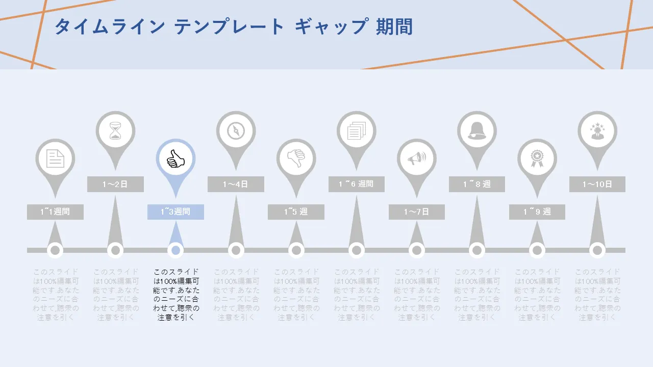 このプロフェッショナルな PowerPoint テンプレートは、チームがプロジェクトのタイムライン、マイルストーン、組み込みのギャップと期間マーカーを使用して段階的な実行を視覚化できるように設計されています。ユーザーが複数週間または複数日にわたるプロジェクトの段階を視覚的に明確に計画できるようにすることで、戦略的計画をサポートします。このテンプレートは、部門間でタイムラインを効果的に伝達する必要があるプロジェクト マネージャー、製品チーム、経営幹部に最適です。