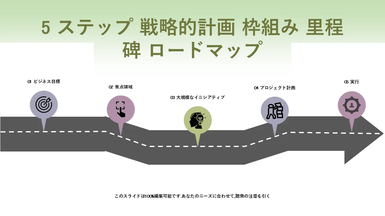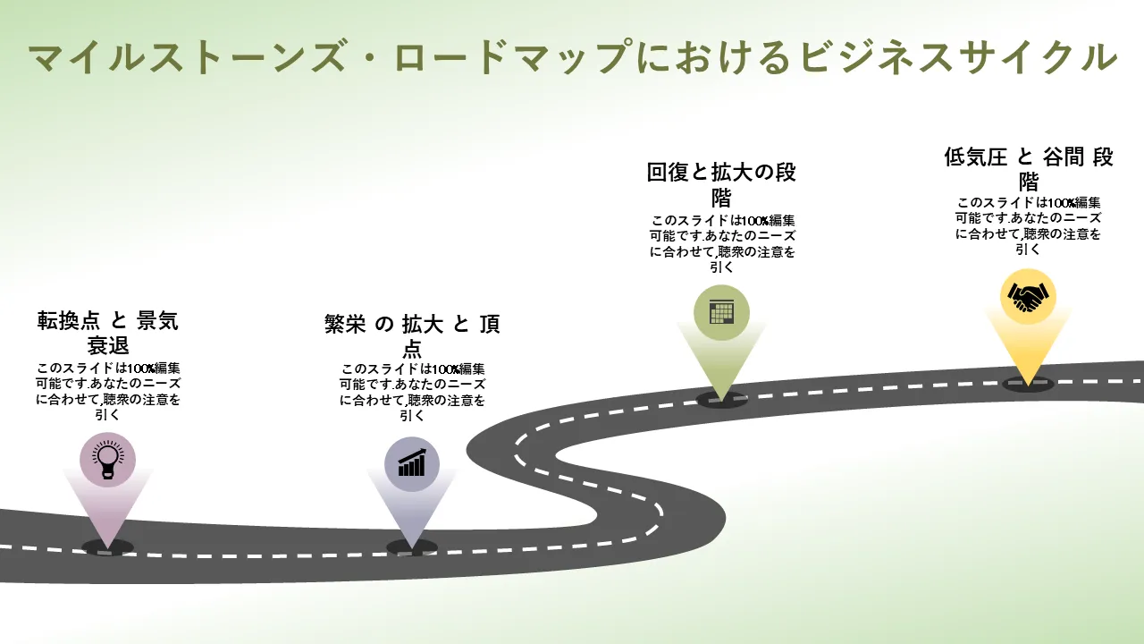 マイルストーン ロードマップ 戦略的計画フレームワーク ビジネスの方向性 目標達成 準備 プロフェッショナルプレゼンテーション用のPowerPointのテンプレートの特徴