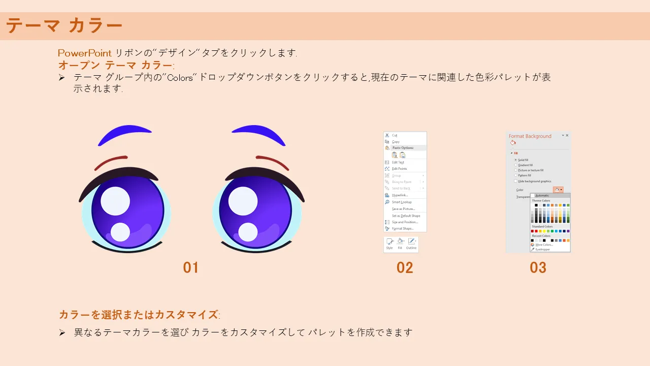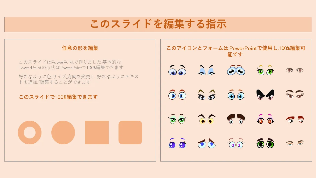 - スライド全体で感情や個性を伝える、表情豊かな漫画の目のグラフィック