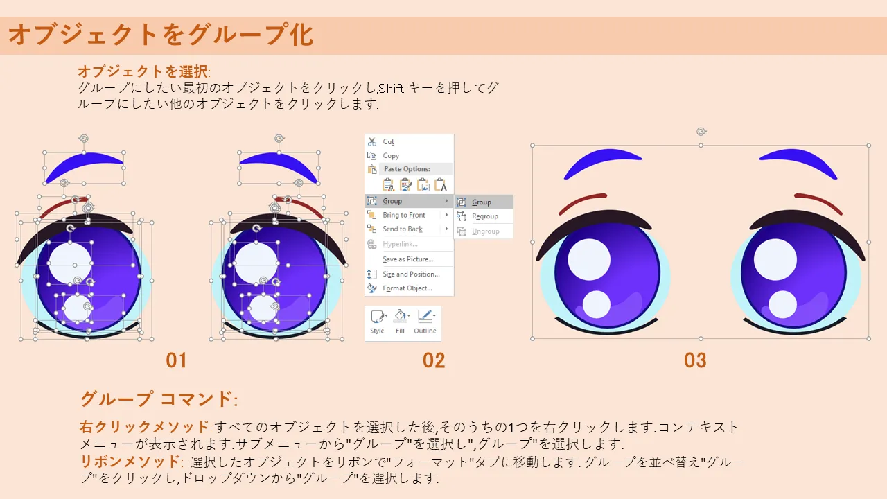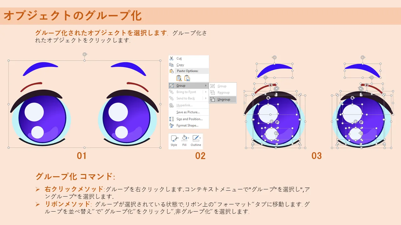 - 高度な編集のための要素のグループ化とグループ解除の手順が含まれています