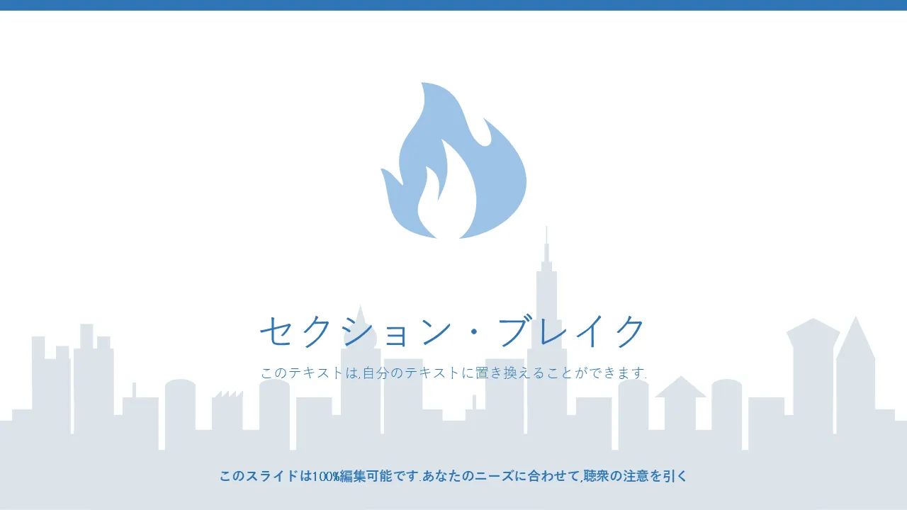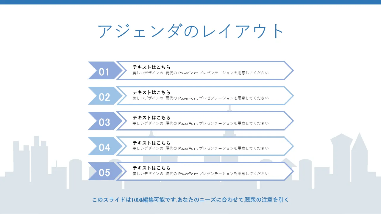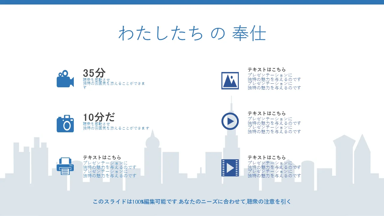 - 編集可能な建物アイコンとスカイライン背景を備えたモダンな都市景観ビジュアル