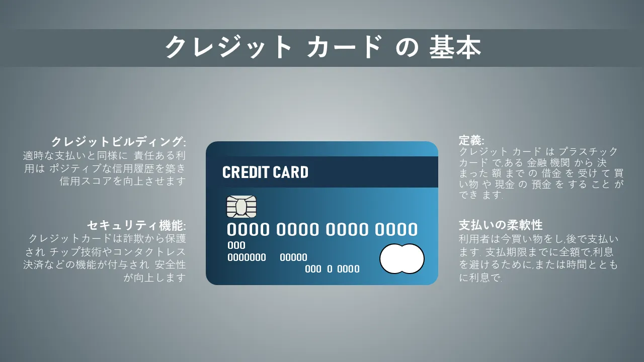 この PowerPoint テンプレートは、金融専門家から小売消費者に至るまで、クレジット カードの基礎を視覚的に説明するように設計されています。標準カード、特典カード、安全カード、残高転送カードなどの主要なクレジット カード タイプを、明確で魅力的なビジュアルでカバーしています。このテンプレートは、クレジット カードの知識が不可欠な金融教育、製品の発表、または顧客オンボーディング セッションに最適です。