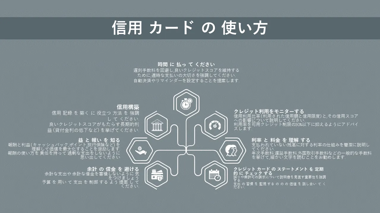 金融機関、クレジット カード発行会社、フィンテックの新興企業は、このテンプレートを使用して顧客を教育したり、新しいユーザーをオンボーディングしたりします。社内トレーニング セッション、投資家向けプレゼンテーション、クレジット カードのサービスを説明するマーケティング資料にも最適です。このテンプレートは、金融アドバイザー、顧客サービス マネージャー、銀行、フィンテック、小売業界の製品マーケティング担当者などの役割に適しています。