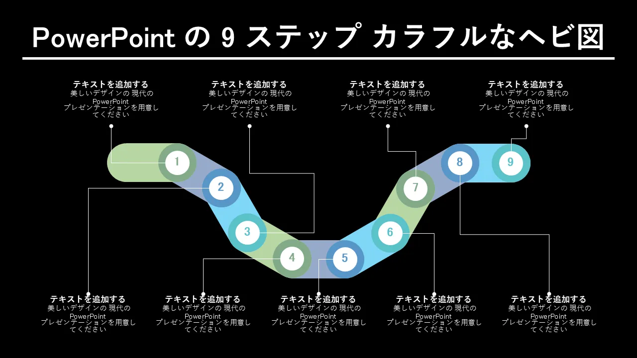 9 ステップのカラフルなスネーク ダイアグラム PowerPoint テンプレートの説明