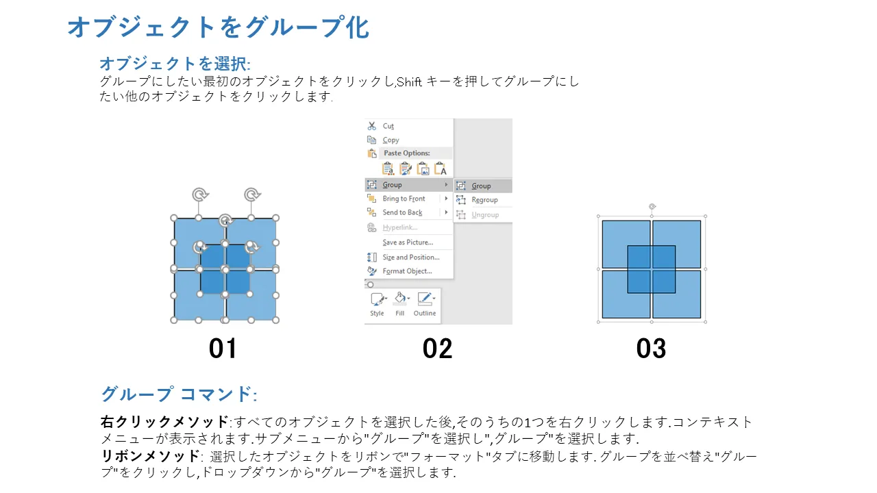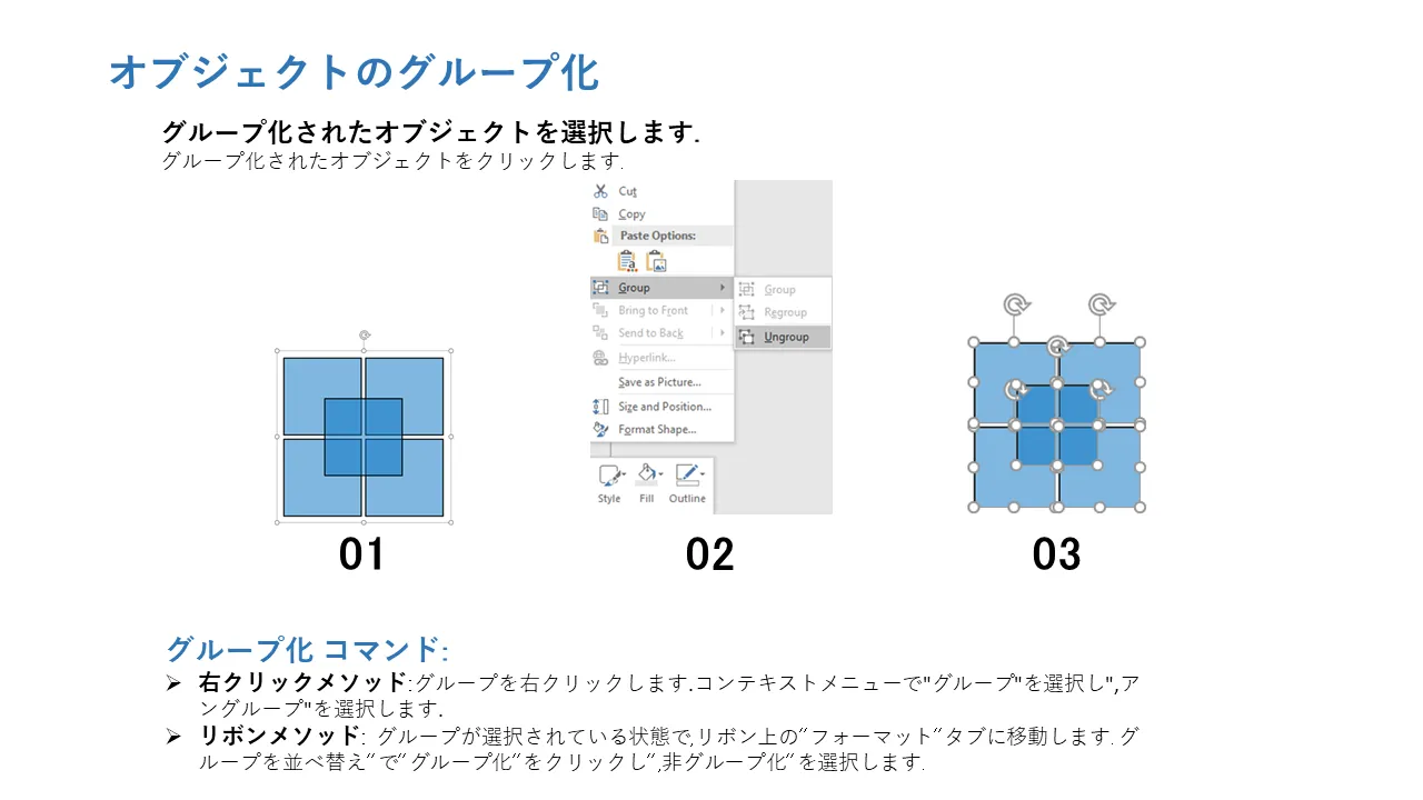 - 高度なスライド操作のためのグループ化とグループ解除の手順が含まれています