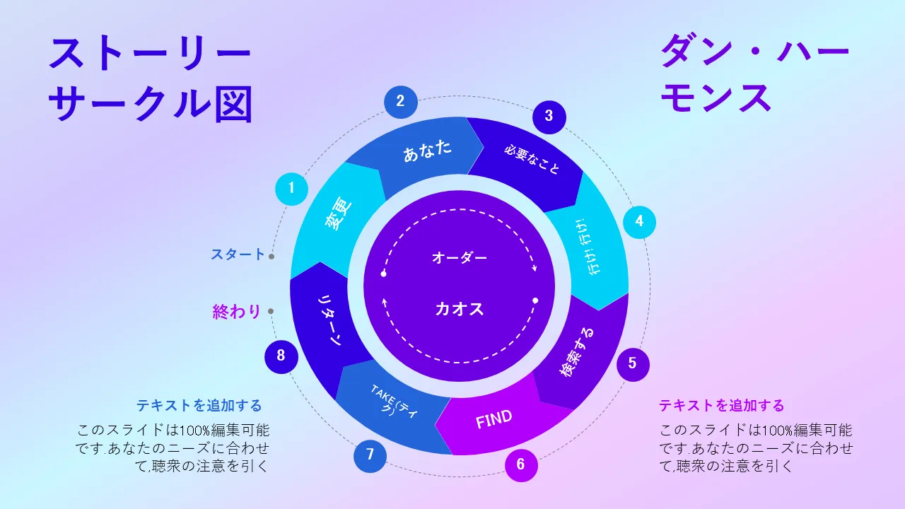 パワーポイント用のダン・ハーモン・ストーリー・サークル図の特徴