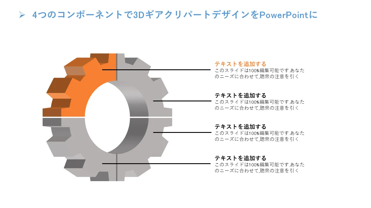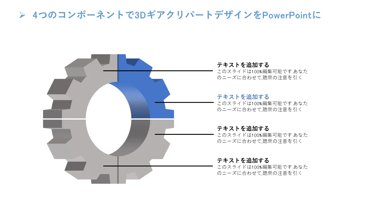 Powerpoint 用の 4 つのコンポーネントを含む 3D ギア クリップアート デザインの特徴