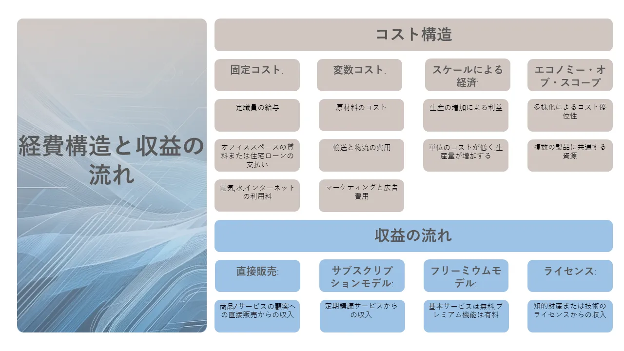 - コスト構造や主要パートナーなどの主要なビジネスモデル要素にすぐに使用できるプレースホルダー