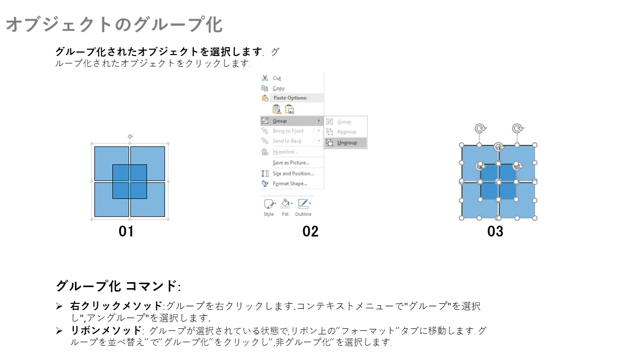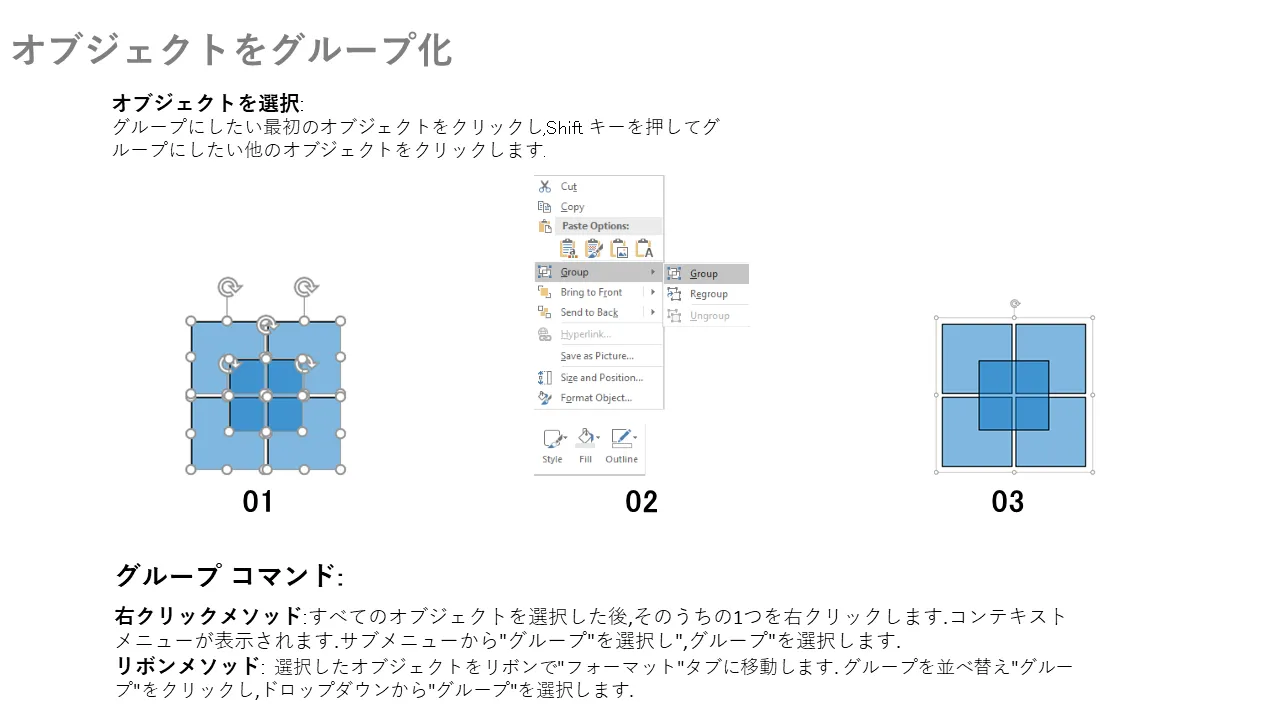 - オブジェクトの位置合わせを容易にする事前設定されたグループ化ツールと、編集