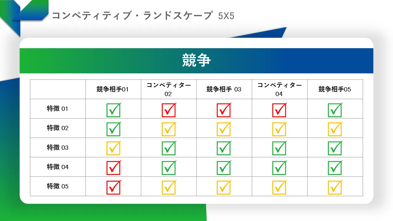 - 市場参加者を簡単に視覚的に比較できる、事前に設計された競争力マトリックス レイアウト