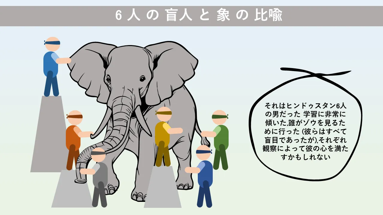 プロフェッショナルなプレゼンテーション用の6人の盲人男性と象のメタファーPowerPointのテンプレート