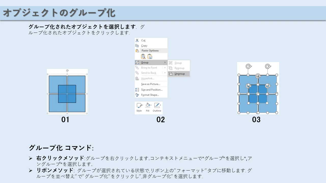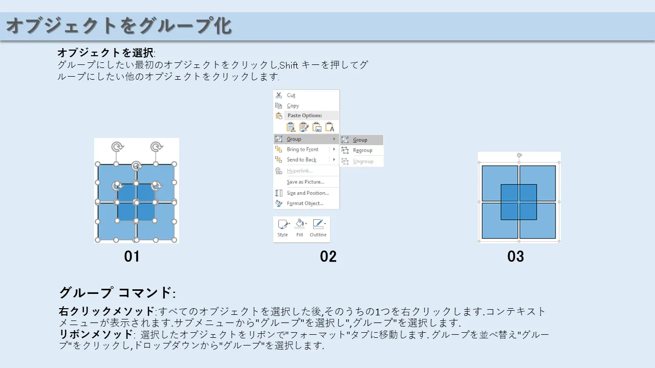- 要素を効率的にグループ化および配置するための説明ガイドが含まれています
