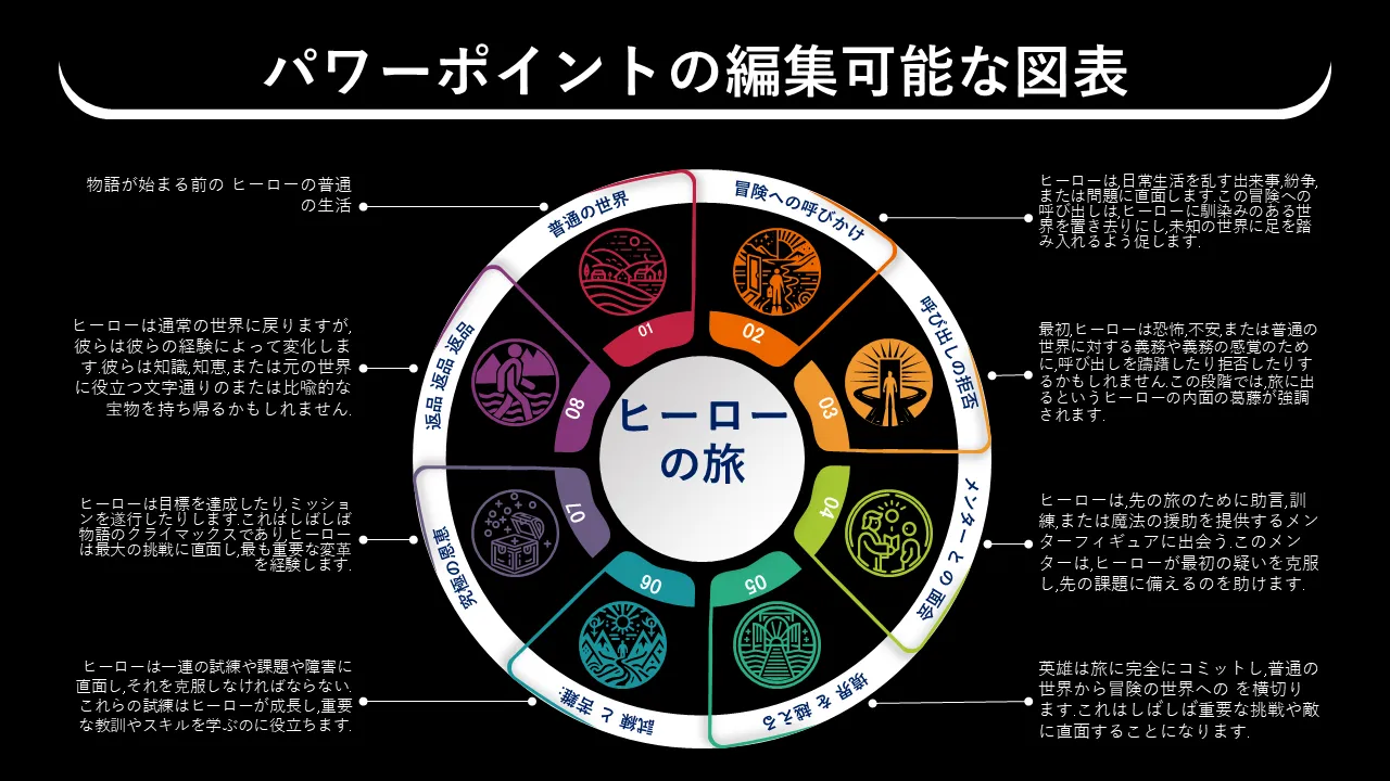 英雄の旅 PowerPoint の編集可能な図 プロフェッショナルなプレゼンテーション用の PowerPoint テンプレートの特徴
