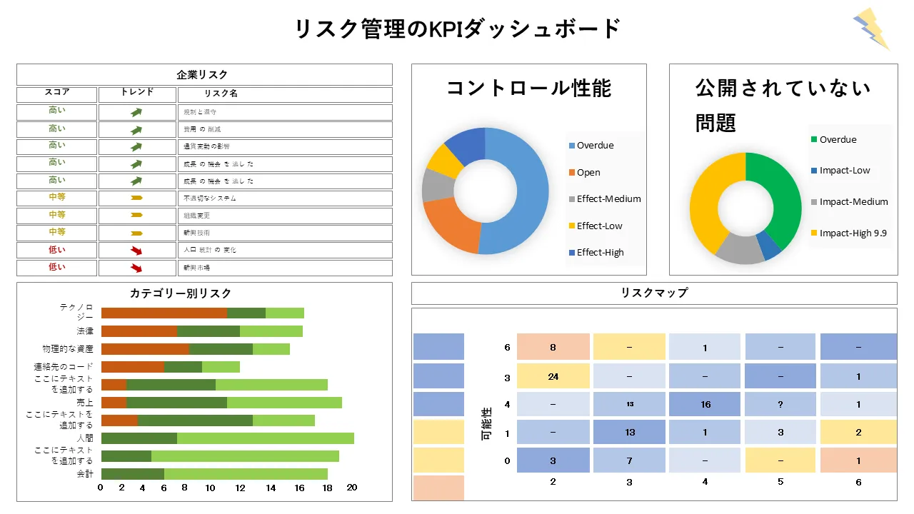 未解決の問題とコントロールパフォーマンスを示すリスク管理KPIダッシュボード プロフェッショナルプレゼンテーション用のPowerPointのテンプレート
